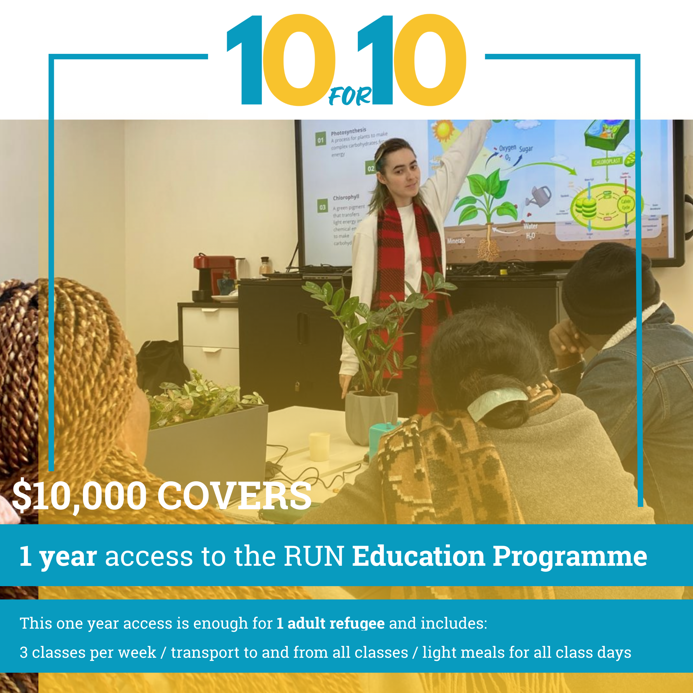 provides 1 year access to the RUN Education Programme for 1 adult refugee and includes 3 classes per week, transport to and from classes and light meals on class days