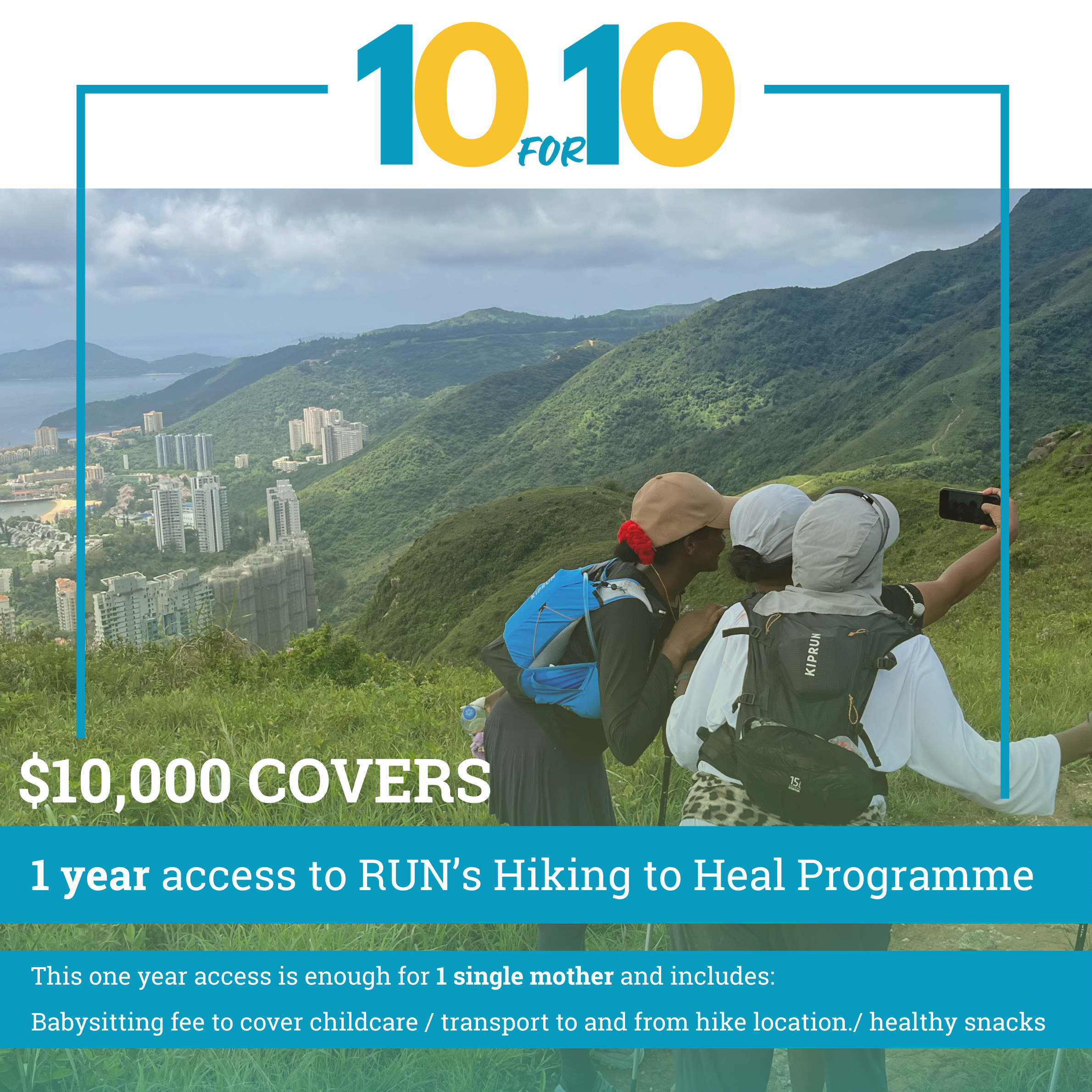 provides 1 year access to RUN’s Hiking to Heal Programme for 1 single mother and includes babysitting fees to cover childcare, transport to and from hike location and healthy snacks