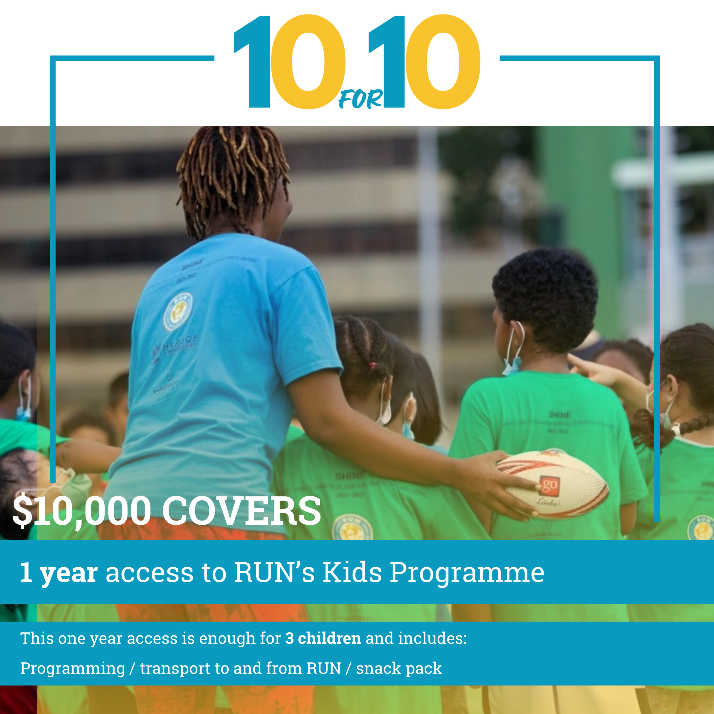 provides 1 year access to RUN’s Kids Programme for 3 children and includes programming, transport to and from RUN and a snack bag